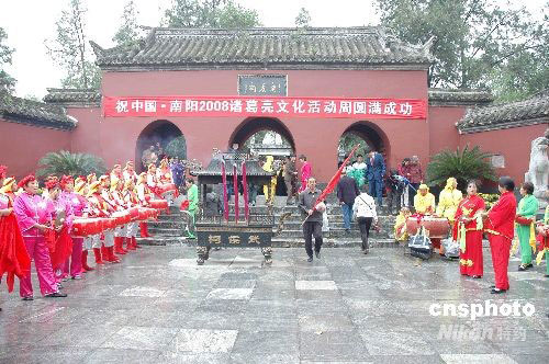 9月27日(農(nóng)歷八月二十八)是我國古代著名政治家、軍事家諸葛亮仙逝1774年忌日,也是明代世宗皇帝欽定的南陽臥龍崗祭拜諸葛亮的秋祭日。當天上午,以弘揚諸葛亮“鞠躬盡瘁,死而后已”精神為主旨的“中國南陽2008紀念諸葛亮文化活動周”在諸葛亮躬耕地——南陽市臥龍崗武侯祠隆重開幕,吸引眾多國內外的專家、學者和游客前來參觀、朝圣和游覽。9月27日至10月2日“諸葛亮文化周”期間,武侯祠將舉行大型民間藝術表演、漢代樂舞表演、畫家走進臥龍崗、三國謎語有獎競猜、品嘗三國文化宴等豐富多彩的活動。中新社發(fā) 熊運彬 攝