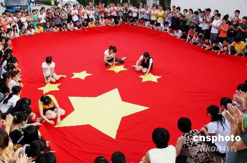 9月27日下午,隸屬于江西省上饒經(jīng)濟(jì)開發(fā)區(qū)的臺資企業(yè)江西宏福服裝公司廠區(qū)內(nèi),幾百名縫紉女工匯集一起,共同縫制了一幅長10米、寬7米的巨型五星紅旗,并以此來慶祝祖國59華誕和神七順利飛天,表達(dá)出他們熱愛祖國的心情。中新社發(fā) 卓忠偉 攝