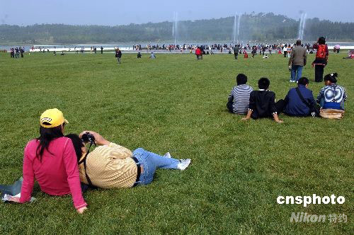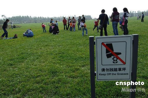 9月29日,北京奧林匹克森林公園露天劇場大草坪被迫準(zhǔn)許游人進(jìn)入休閑,草坪大面積遭到踐踏。北京殘奧會閉幕后,該草坪在禁止游人進(jìn)入時,一直有游客違規(guī)強(qiáng)行進(jìn)入,并不斷與保安人員發(fā)生沖突。鑒于近期警員、保安、志愿者紛紛休假離去,森林公園管理機(jī)構(gòu)正式撤除了草坪阻攔線,默許游人在此行走,滯留。中新社發(fā) 鄒憲 攝