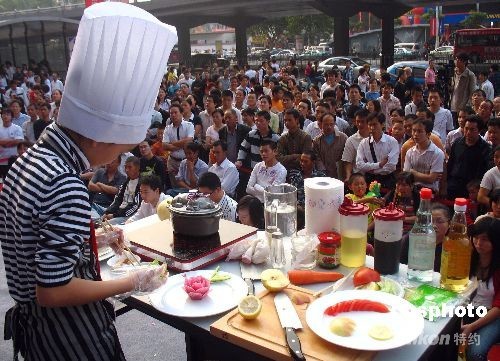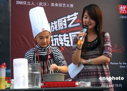2008年10月1日,武漢市漢口航空路一廚藝大賽現(xiàn)場,11歲女童余秋萍上臺和成年人一起比賽烹調(diào)技藝。據(jù)了解,小學生余秋萍從9歲就開始學習廚藝,經(jīng)常在家炒菜做飯,認為自己的手藝不錯,就報名參加了這次比賽。中新社發(fā) 孫新明 攝