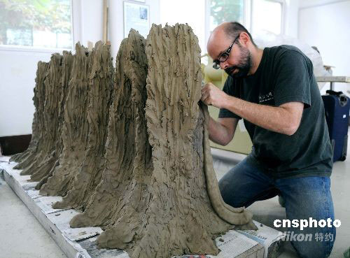 “十一”黃金周期間,來(lái)自美國(guó)、希臘、韓國(guó)、阿根廷等7個(gè)國(guó)家的16名陶藝大師會(huì)聚山東省淄川李梓源藝術(shù)中心切磋技藝,展示陶藝絕活。圖為美國(guó)檀香山夏威夷大學(xué)副教授、陶藝家布萊德·伊萬(wàn)·泰勒正在創(chuàng)作作品。中新社發(fā) 閆盛霆 攝