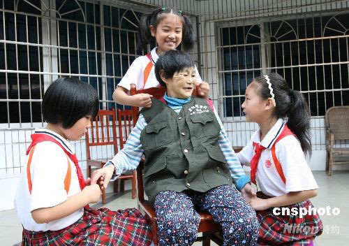 10月7日,由四川省廣安市廣安區(qū)東方小學(xué)的10多名少先隊(duì)員組成的愛心志愿者小分隊(duì)來到濃洄敬老院,看望生活在這里的40多位老人,為老人送上節(jié)日禮物,為老人打掃房間,陪老人聊天、散步,為他們送去重陽節(jié)的祝福,陪伴他們度過災(zāi)后首個(gè)重陽節(jié)。 中新社發(fā) 杜修戰(zhàn) 攝