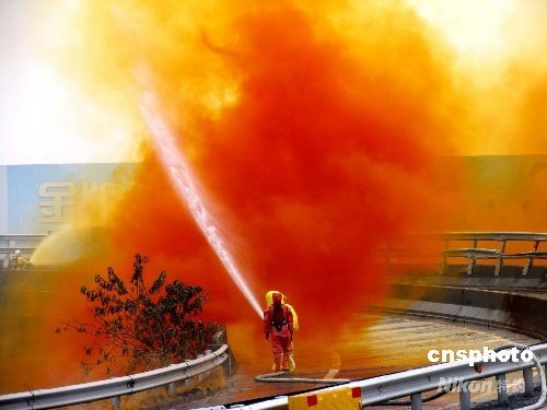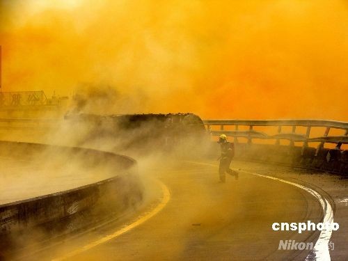 10月7日10時(shí)11分,位于杭甬高速公路寧波段塘出口處,一裝載29噸硝酸的槽罐車在自西向東行駛過程中,撞擊護(hù)欄后側(cè)翻,發(fā)生泄露事故。中新社發(fā) 何蔣勇 攝