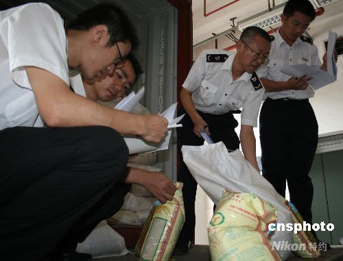 10月9日,參展第五屆中國—東盟博覽會的首批貨物順利抵達(dá)南寧。該批貨物為來自柬埔寨的大米、酒和木制家具等,廣西出入境檢驗檢疫局和南寧海關(guān)在確保對疫病疫情有效監(jiān)管的前提下,實行“聯(lián)合辦公、共同查驗、一站式服務(wù)”的工作機(jī)制,迅速為展品辦理通關(guān)手續(xù)。中新社發(fā) 林艷華 攝