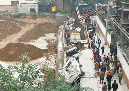 10月8日11時45分左右,位于西安市新城區(qū)長纓東路的北張家莊村里,一處長約70米的道路突然發(fā)生大面積塌陷,坍塌面積大約有300平方米,造成停放在公路上的9輛貨運汽車瞬間掉入了深約3米的坑中。路面塌陷過程中,附近群眾都以為是地震了,遂四散逃離。該起事故沒有造成人員傷亡,塌陷原因目前正在調(diào)查當中。