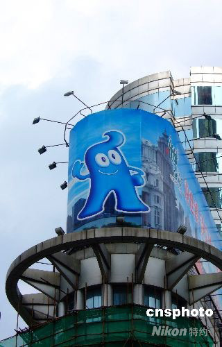 2008年10月9日,上海在迎世博600日活動中高潮迭起,“海寶”形象紛紛登上高樓。中新社發(fā) 蔣振雄 攝