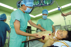 來到醫(yī)院后王女士已經出現(xiàn)意識模糊,同時伴有劇烈的胸痛。胸外科主任張臨友教授和副主任徐廣全教授迅速組織相關科室人員會診,爭取快速摸清患者胸腔內的情況和鋼筋對各器官造成的損傷。由于消防隊員在切割鋼筋時怕傷到王女士,所以切割點離傷口較遠,造成留在體外的鋼筋較長,傷者無法進入CT拍攝影像,給診斷帶來了很大的困難。醫(yī)生只得為王女士進行了胸部的X光片檢查。依靠豐富的臨床經驗和X光片,醫(yī)生判斷王女士的肺組織已經損傷,必須立即開胸探查。