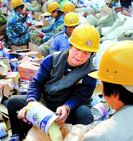 圖為工人將問題奶粉分揀裝袋以便銷毀!逗颖比請蟆酚浾 馬建敏、趙永輝攝影報道
