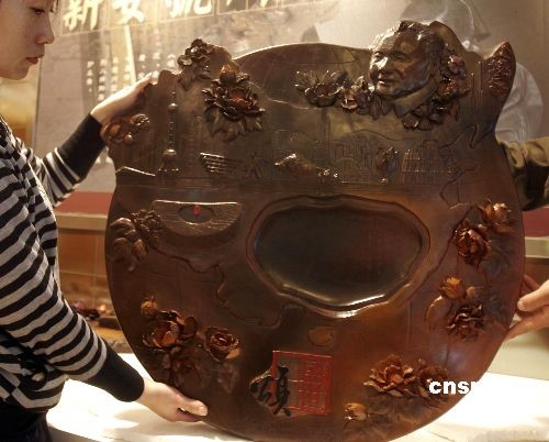 10月15日,一方取名為“盛世頌”的巨型澄泥硯臺在河南洛陽制作完畢亮相。據(jù)悉,這是為紀(jì)念中國改革開放30年,中國工藝大師李中獻(xiàn)及其弟子李湛歷時(shí)近一年傾心制作的。中新社發(fā) 張曉理 攝