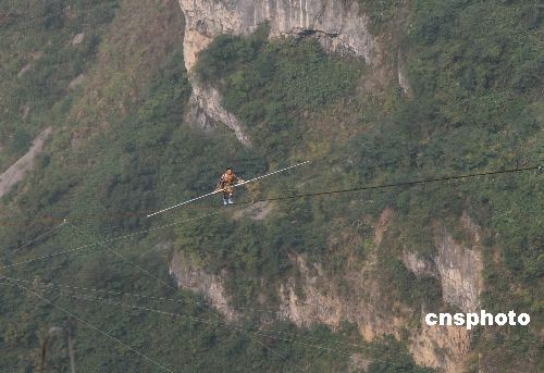 18日,“高空王子”阿迪力的親侄子賽買提·艾江在張家界天門山的萬仞絕壁之間展示了“達瓦孜”的驚人絕技。雖然賽買提在最后50米處意外“失手”,被救援人員接回終點,但在傾斜達39度的鋼繩上行走了650米,已經(jīng)成功挑戰(zhàn)了世界最大斜度的高空走鋼絲極限!斑_瓦孜”意思是“高空走繩索”,是新疆維吾爾族歷史悠久的民間傳統(tǒng)絕技。中新社發(fā) 鄧霞 攝