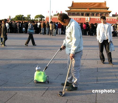 2008年10月26日,一種專(zhuān)門(mén)清理口香糖的袖珍電動(dòng)清潔機(jī)亮相北京天安門(mén)廣場(chǎng)。圖為環(huán)衛(wèi)工人使用它清洗大理石上的口香糖。中新社發(fā) 玉龍 攝