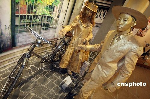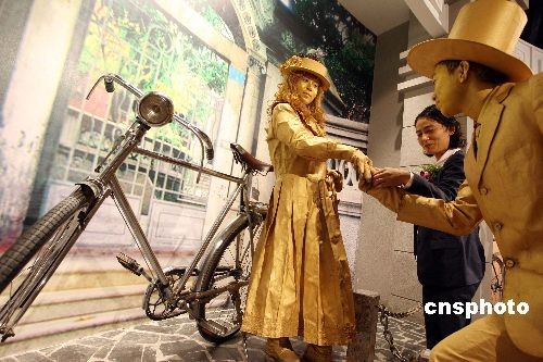 10月28日,行為藝術(shù)者在河北省霸州市新落成的華夏民間收藏館自行車博物館內(nèi)表演,表演者倚靠的是著名民間收藏家王明璽老人收藏的1910年英國生產(chǎn)的白金人牌自行車。該車只生產(chǎn)了100輛,進(jìn)入中國10輛,這是目前發(fā)現(xiàn)保存最為完好的一輛。當(dāng)日,第二屆霸州文化藝術(shù)節(jié)在河北省霸州市隆重開幕。中新社發(fā) 毛建軍 攝
