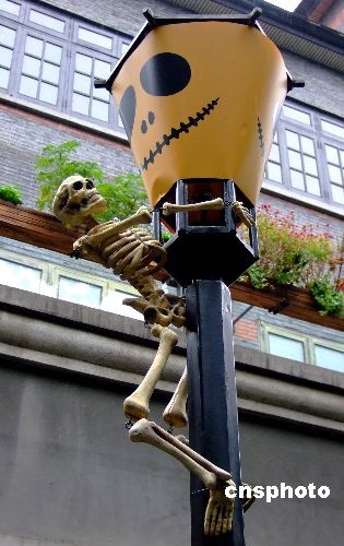 2008年10月29日,為迎接2008萬圣節(jié),上海新天地酒吧街已完成全程置景的設(shè)計布置,以綿延酒吧街?jǐn)?shù)十處的萬圣置景,為游客“講述不怕鬼的故事”。南瓜頭鬼,白骨嶙峋鬼,美女鬼,小丑鬼……在路邊、酒桌上、樹頂、草地里、燈桿上、石庫門陽臺間,夸張得有趣,吸引游人目光。中新社發(fā) 蔣振雄 攝