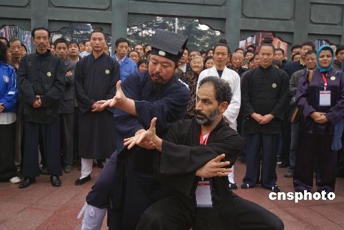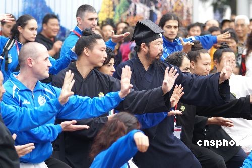 10月29日,第三屆世界傳統(tǒng)武術(shù)節(jié)在湖北十堰市舉行,來(lái)自69個(gè)國(guó)家和地區(qū)的165個(gè)代表隊(duì)的2000多名武術(shù)愛好者匯聚湖北十堰。當(dāng)日上午,來(lái)自世界各地的洋弟子們?cè)谑呤腥嗣駨V場(chǎng)拜武當(dāng)派第14代掌門、武當(dāng)派武術(shù)的代表人物游玄德道長(zhǎng)為師,并進(jìn)行武術(shù)表演。中新社發(fā) 稅曉潔 攝