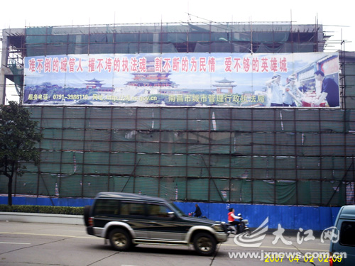 對(duì)此,南昌市行政執(zhí)法局直屬二大隊(duì)辦公室主任黃躍說(shuō),宣傳語(yǔ)是南昌市行政執(zhí)法局東湖分局懸掛的。該大樓報(bào)批時(shí)只說(shuō)改造,如今,打著改造的名義重新搭建,屬于違章建筑。記者鄒曉華 實(shí)習(xí)生李芳