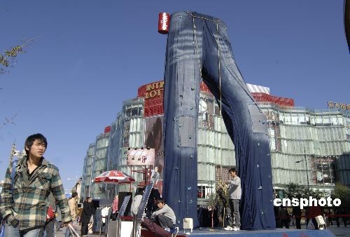 10月31日,北京王府井金街上的某商家樹起巨型牛仔褲招牌造型,吸引路人目光。在全球金融危機(jī)大背景下,眾多商家不得不利用各種新奇手法賺人眼球。中新社發(fā) 徐曦弋 攝
