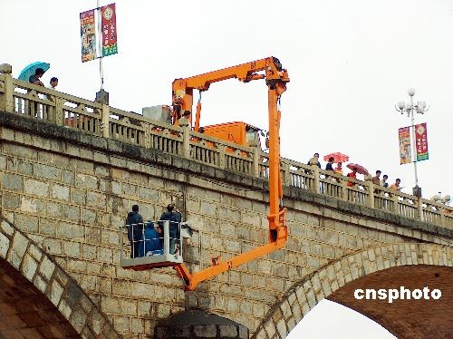 11月2日上午,廣西南寧公路局工程技術(shù)人員冒細(xì)雨為中國當(dāng)代最長的石拱橋——--龍州大橋“把脈探傷”。龍州大橋建于上世紀(jì)60年代,為七拱方塊石料結(jié)構(gòu),橋長約252米。在通車的43年來,已經(jīng)受了4次大洪水的考驗。中新社發(fā) 馮文 攝