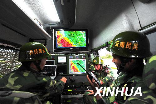 在云南楚雄等地發(fā)生滑坡泥石流災(zāi)害后,云南民兵預(yù)備役應(yīng)急通信分隊(duì)派出安裝著地理信息、GPS定位、衛(wèi)星圖像傳輸、微波無(wú)線通信等車載工作系統(tǒng)組合的移動(dòng)指揮車及數(shù)輛前方信息偵察車,用科技手段為救災(zāi)工作提供精確信息和清晰圖像。新華社記者 陳海寧 攝
