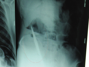6日上午,記者在徐州礦務(wù)集團(tuán)總醫(yī)院重癥監(jiān)護(hù)室見到了這名男子,目前他雖然已經(jīng)恢復(fù)了意識(shí),但還不能開口說話,需要呼吸機(jī)輔助呼吸。據(jù)醫(yī)生介紹,4日中午12時(shí)左右,這名男子因服毒輕生被緊急送到醫(yī)院進(jìn)行搶救,之前,這名男子已經(jīng)在當(dāng)?shù)剜l(xiāng)鎮(zhèn)醫(yī)院進(jìn)行了近20小時(shí)的治療,但效果不佳!安∪吮晦D(zhuǎn)院到礦總院時(shí)已神志不清,血壓極低,處于休克狀態(tài)!本茸o(hù)人員給男子洗胃、初步處理以后,發(fā)現(xiàn)男子呼吸急促,于是趕緊給他拍片檢查。結(jié)果讓所有的醫(yī)生大吃一驚,竟有一把尖狀異物橫在該男子腹腔內(nèi)!當(dāng)天下午5時(shí)30分,輕生男子被推上了手術(shù)臺(tái)。經(jīng)過40多分鐘的手術(shù),該男子腹腔被打開,手術(shù)醫(yī)生發(fā)現(xiàn),男子體內(nèi)的金屬狀異物竟然是一把長(zhǎng)19厘米的尖刀!