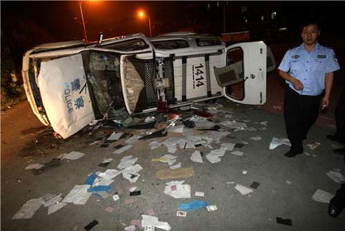 被砸警車一地“雞毛” 記者 霍健斌 攝