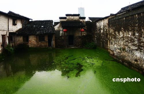 11月8日下午,位于浙江紹興市區(qū)的王羲之故宅前墨池一片綠色,據(jù)了解,這是由于藍(lán)藻和浮萍的侵襲而形成的。中新社發(fā) 李瑞昌 攝