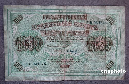 據(jù)考證,山東濱州發(fā)現(xiàn)的這張面值1000元盧布,是俄國(guó)克倫斯基臨時(shí)政府1917年在中國(guó)東北發(fā)行流動(dòng)的紙幣,它見證了中國(guó)的屈辱歷史。中新社發(fā) 梁寶海 攝