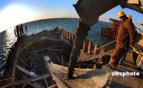 背景資料:曹妃甸特大橋是遷曹鐵路全線重點(diǎn)控制工程,全長7477.26m,為雙線橋梁,包括下部結(jié)構(gòu)樁基1973根、橋墩臺(tái)243個(gè),以及相應(yīng)施工便道、筑島平臺(tái)填筑和跨1400m的納潮河段施工棧橋、平臺(tái)搭設(shè);上部結(jié)構(gòu)現(xiàn)澆4處15孔共339.44m,架設(shè)預(yù)制梁227孔。跨納潮河段水深6至18m,納潮河主跨連續(xù)箱梁施工是重中之重,原設(shè)計(jì)為(40+64+40)分段懸臂澆注施工。該工程于2008年4月中旬開工,面對(duì)工期緊、任務(wù)重、安全和質(zhì)量風(fēng)險(xiǎn)大等諸多重難點(diǎn)問題,從集團(tuán)公司到項(xiàng)目部各級(jí)領(lǐng)導(dǎo)高度重視,層層發(fā)動(dòng),統(tǒng)一思想;著力加強(qiáng)現(xiàn)場(chǎng)組織領(lǐng)導(dǎo)力量,加大施工現(xiàn)場(chǎng)人力、物力的投入;不斷優(yōu)化施工方案,嚴(yán)控布控,精心組織,科學(xué)施工,全力攻堅(jiān)。先后組織了“百日大干,任務(wù)過半”、“決戰(zhàn)60天,貫通曹西線”等建功立業(yè)競(jìng)賽活動(dòng),目前已完成實(shí)物工作量95%,預(yù)計(jì)2008年底全線貫通。中新社發(fā) 朱鴻山 攝