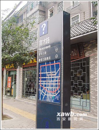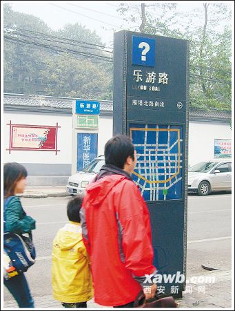 18日下午,大雁塔附近的育才路路口一個(gè)約2米高的黑色簇新路牌引人注目,不時(shí)有游客打扮的人上前查看道路信息。但是,路牌“育才路”三個(gè)漢字上方標(biāo)示的一個(gè)大大的白色“?”號(hào),引起了不少查看者的疑惑。兩名游客先是在路牌下方的城區(qū)交通旅游圖上尋找著“育才路”的方位,而后又仰頭看著“大問號(hào)”撓起了頭:“咱們現(xiàn)在是在育才路上嗎?這不會(huì)是表示路名待定吧……”