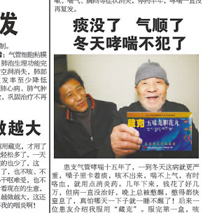“患友介紹我服用了‘藏克’。服完第一盒,咳嗽、胸悶就緩解多了!弊蛱(22日),看著我市(重慶市)某報上的一則藥品廣告,90歲高齡的老人張治欽感到納悶,“我從來沒得過這病,卻上了該藥的宣傳廣告!