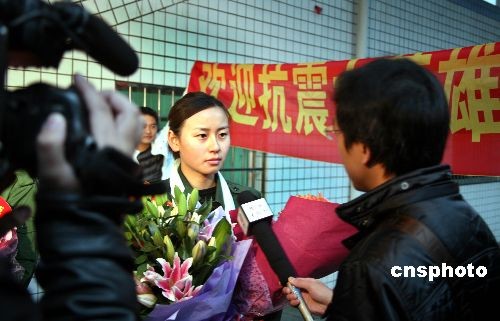 11月26日晨,武警某部貴陽(yáng)籍女警花徐一蝶和楊帆退伍還鄉(xiāng),乘火車從成都回到貴陽(yáng)。親朋好友、同學(xué)和慕名而來(lái)的人群捧著鮮花在月臺(tái)迎接這兩位在汶川大地震中做出突出貢獻(xiàn),立功受獎(jiǎng),并受到溫家寶總理接見(jiàn)的女警花。今年5月14日,徐一蝶和楊帆在救災(zāi)過(guò)程中表現(xiàn)突出,被分別授予二等功和三等功1次。中新社發(fā) 彭年 攝