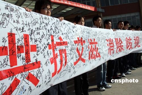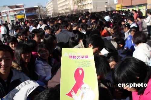 2008年11月28日上午,山東濱州學(xué)院大學(xué)生舉著印有“攜手同行,共抗艾滋,消除歧視,共享健康”的條幅。當(dāng)日,在世界艾滋病日來臨前夕,濱州紅十字會(huì)與濱州學(xué)院聯(lián)合舉辦了此次簽名活動(dòng),吸引了學(xué)院萬余名大學(xué)生熱情參與。中新社發(fā) 郭志華 攝