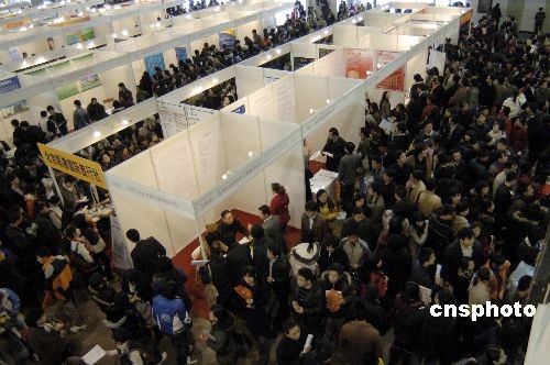 11月29日,大型部委聯(lián)合招聘會(huì)在北京中國(guó)國(guó)際展覽中心舉行,中科院、時(shí)代集團(tuán)、中國(guó)日?qǐng)?bào)社、百度等700多家單位招攬人才,近萬(wàn)個(gè)工作崗位令求職者趨之若騖。據(jù)悉,金融危機(jī)下的就業(yè)形勢(shì)不容樂(lè)觀,許多應(yīng)屆畢業(yè)大學(xué)生主動(dòng)降低薪酬期望值,以期盡快就業(yè)。中新社發(fā) 徐曦弋 攝