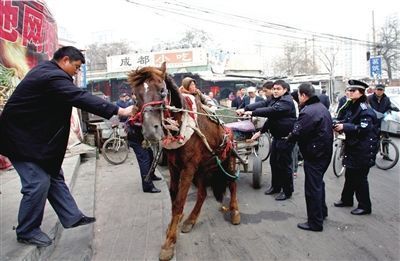 11月29日,一女商販駕馬車與城管“角力”。當(dāng)日9時(shí)許,這名賣橘子的女商販與同伴被宣武城管廣外分隊(duì)查獲。女商販趁人不備坐上馬車,一抖韁繩命令拉車黃馬躥向周圍圍觀的人群。幸有便衣工作人員(左)與城管死死拉住,才未釀出大禍。(周民 袁國(guó)禮)