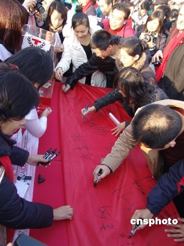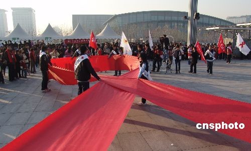 12月1日,在北京舉行的紀(jì)念世界艾滋病日大型宣傳活動(dòng)上,一些青年打開一幅巨型紅絲帶征集簽名,以表達(dá)對(duì)艾滋病感染者、病人及其家庭的關(guān)愛。當(dāng)天是世界艾滋病日,中國(guó)紅十字會(huì)總會(huì)、聯(lián)合國(guó)艾滋病規(guī)劃署和紅十字會(huì)與紅新月會(huì)國(guó)際聯(lián)合會(huì),共同在北京舉辦“同一個(gè)夢(mèng)想——沒有歧視的世界”紀(jì)念世界艾滋病日大型宣傳活動(dòng)。中新社發(fā) 范欣 攝