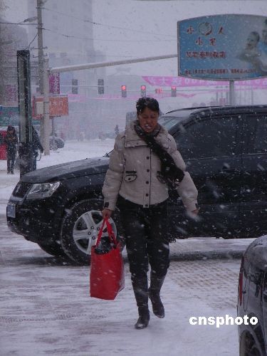 2008年12月3日,齊齊哈爾市再次降雪,城市銀裝素裹。當?shù)貧庀笈_發(fā)布藍色寒潮預警信號,提醒市民做好預防寒潮準備。中新社發(fā) 王云龍 攝