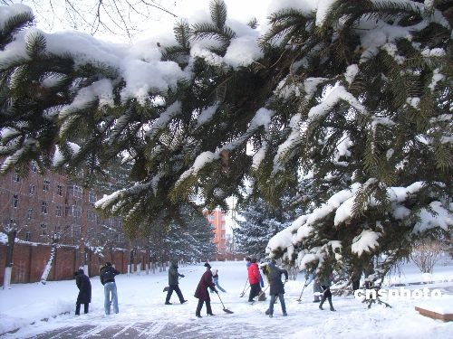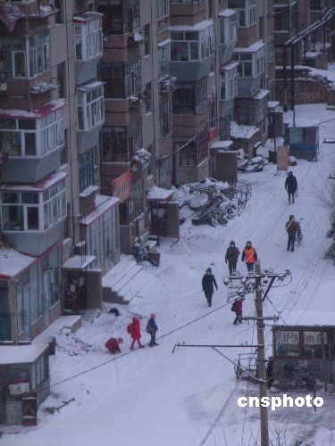 2008年12月4日,齊齊哈爾市再次降雪,城市銀裝素裹。當(dāng)?shù)貧庀笈_(tái)發(fā)布藍(lán)色寒潮預(yù)警信號(hào),提醒市民做好預(yù)防寒潮準(zhǔn)備。齊齊哈爾市已經(jīng)連續(xù)兩天降雪,降雪給城市交通帶來(lái)了不便,車(chē)輛紛紛緩行,市民忙著清掃道路上的積雪。中新社發(fā) 王云龍 攝