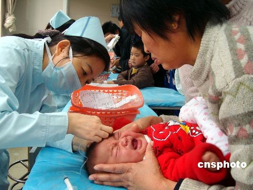 2008年12月4日,蘇州市兒童醫(yī)院的醫(yī)護(hù)人員在為患兒輸液。當(dāng)日,受北方冷空氣影響,蘇州氣溫大幅下降,來醫(yī)院就診的患兒也比平時增加四成左右,大部分患兒是由于受涼而引發(fā)感冒、發(fā)燒等不適。中新社發(fā) 王建康 攝