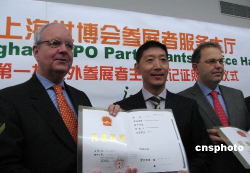 12月5日,中國2010年上海世博會首批境外參展者完成主體登記,獲頒證照。此舉標志著上海世博會面向全球的參展服務啟動。圖為荷蘭展區(qū)總代表魏偉勵(左一)、盧森堡展區(qū)副總代表費瑞朋(右一)等從上海官員手中接過營業(yè)執(zhí)照等。中新社發(fā) 許曉青 攝