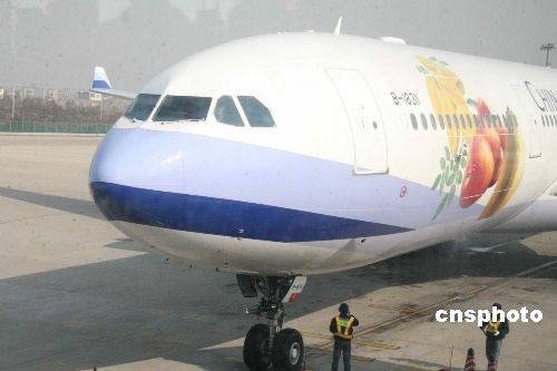 臺(tái)灣地區(qū)中華航空的CI七九八九越過(guò)海峽,于十二月十五日十點(diǎn)十分飛抵浙江杭州蕭山機(jī)場(chǎng)。機(jī)身上印著臺(tái)灣的水果。中新社發(fā) 汪恩民 攝