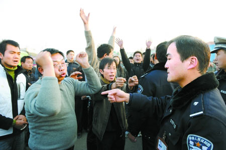 雙方中間,則有20多名民警維持秩序,不時(shí)地將撕扯的雙方拉開,場(chǎng)面一度十分混亂。