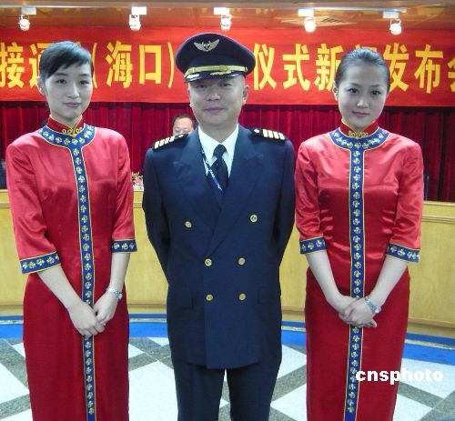 十二月二十日,海口-臺(tái)北將首開(kāi)直航航線。海南航空為順利完成此次首航,特別推出精干的機(jī)組人員。機(jī)長(zhǎng)蒲明(中)曾執(zhí)飛2005年兩岸春節(jié)包機(jī)最后一個(gè)航班。乘務(wù)長(zhǎng)和頭等艙乘務(wù)員在去年以來(lái)都曾執(zhí)飛過(guò)兩岸中秋、春節(jié)包機(jī)。中新社發(fā) 王辛莉 攝