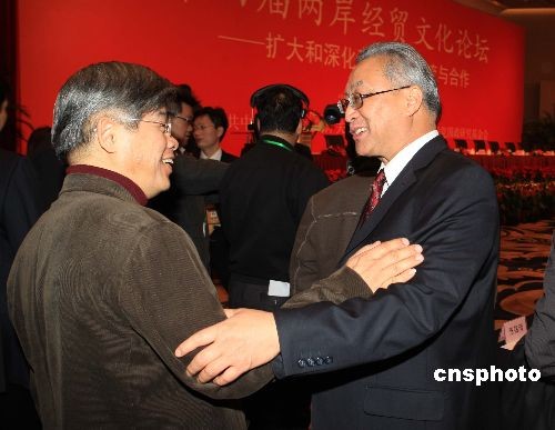 12月20日,第四屆兩岸經(jīng)貿(mào)文化論壇在上海開幕,臺灣記者熱情問候與會的張銘清(右)先生。中新社發(fā) 潘索菲 攝
