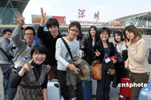 十二月二十一日,日本青少年世代友好代表團(tuán)一行百余人抵達(dá)深圳,他們將前往紅樹林、錦繡中華、民俗文化村、深圳大學(xué)、大族激光等處參觀。圖為日本大學(xué)生抵達(dá)深圳機(jī)場時高興地合影留念。中新社發(fā) 陳文 攝