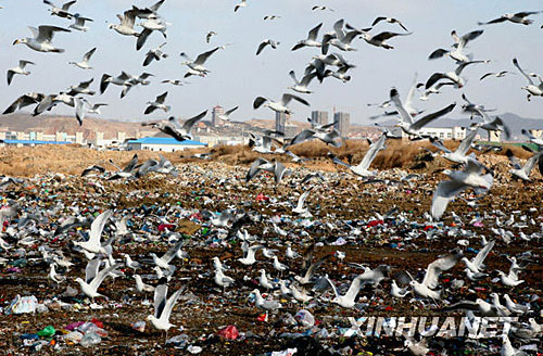 12月22日,成群海鷗在遼寧省大連市毗鄰海岸的一處垃圾場上覓食。連日來,受寒潮襲擊,大連市氣溫急劇下降近10攝氏度,致使渤海灣金州西海岸近海灘涂大面積結(jié)冰。生活在這里的海鷗突遇“糧荒”,不得已選擇毗鄰海岸的城市垃圾場覓食。新華社發(fā)(徐德武 攝)