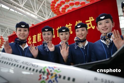 十二月二十六日下午三點(diǎn),青島-臺北直航班機(jī)從青島流亭國際機(jī)場起飛,駛向臺北桃園國際機(jī)場,拉開青島臺北兩市直航的序幕。此后,每周二、周五各有一班常態(tài)包機(jī)航班從青島直飛臺北。青島臺灣直航后,旅程由原來七個(gè)小時(shí)縮短到兩個(gè)半小時(shí),費(fèi)用節(jié)約百分之三十,實(shí)現(xiàn)兩岸一日生活圈的夢想。圖為在首航直飛包機(jī)航班上服務(wù)的部分乘務(wù)人員在慶祝直航儀式上。中新社發(fā) 王群 攝
