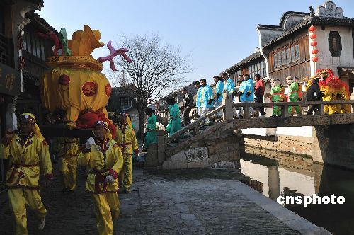 2009周莊開莊大典今日隆重舉行,吸引海內(nèi)外游客駐足觀賞。龍舞獅躍、鑼鼓震天、身穿彩袍、腳瞪皂靴的周莊巨賈“沈萬三”攜丫鬟、家丁百余人親自開莊迎客,并一路引著四海賓客巡游古鎮(zhèn)。具有傳統(tǒng)意義的開莊大典是對周莊文化旅游的又一次補充和延伸。中新社發(fā) 張衛(wèi)青 攝