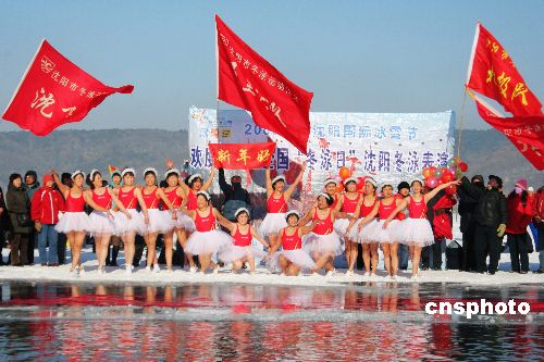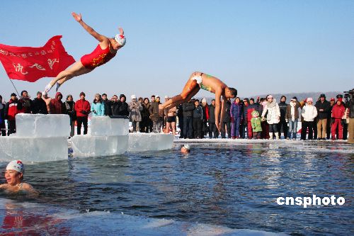 2009年1月1日,遼寧省沈陽(yáng)市歡度新年暨全國(guó)“冬泳日”冬泳表演在棋盤(pán)山冰雪大世界秀湖舉行。150多名冬泳愛(ài)好者進(jìn)行了“天鵝湖”表演及跳水表演。中新社發(fā) 劉寶成 攝