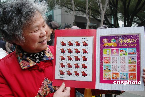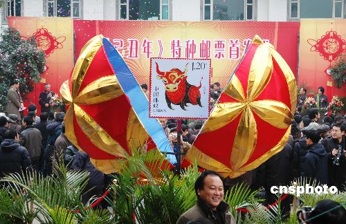 2009年1月5日,以“奔牛”為形象的《己丑年》特種郵票在蘇州正式發(fā)行。該次發(fā)行的《己丑年》郵票一套一枚,面值1.2元。郵票圖案為健壯倔強(qiáng)的奔牛形象,表現(xiàn)出奮力向前的視覺效果,寓意人們對生肖牛年的期望與寄托。中新社發(fā) 朱子寒 攝