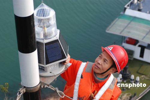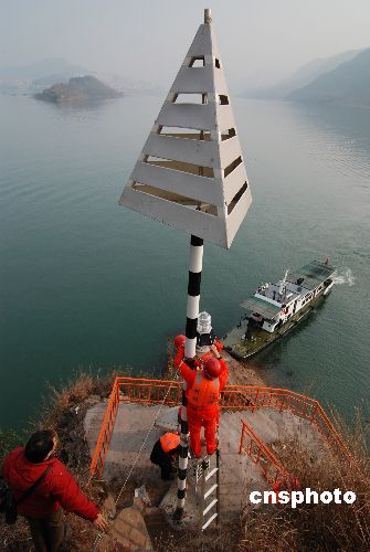 2009年1月8日,在三峽重慶庫區(qū)云陽段,航道管理人員在安裝新型太陽能航標(biāo)燈。這種航標(biāo)燈集太陽能光板、蓄電池、燈具于一體,視距更長、靈敏度更高、耐用性更好,可有效解決三峽庫區(qū)江面增寬和霧氣較大給船舶航行帶來的影響。目前,三峽庫區(qū)航道管理部門正在陸續(xù)更換,僅云陽縣就有30只新型太陽能航標(biāo)燈在春運(yùn)期間投入使用。中新社發(fā) 劉小洋 攝
