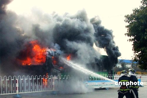 2009年1月9日下午兩時(shí),江蘇鹽城市區(qū)一20路公交車(chē)行駛到鹽瀆路與西環(huán)路交界處發(fā)生自燃,當(dāng)時(shí)車(chē)內(nèi)有七八名乘客,由于疏散及時(shí),并沒(méi)有造成人員傷亡,火也被消防人員及時(shí)撲滅,車(chē)輛卻受損嚴(yán)重,公交部門(mén)初步斷定起火原因是電路故障。中新社發(fā) 李根 攝